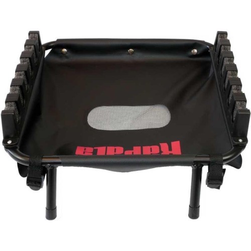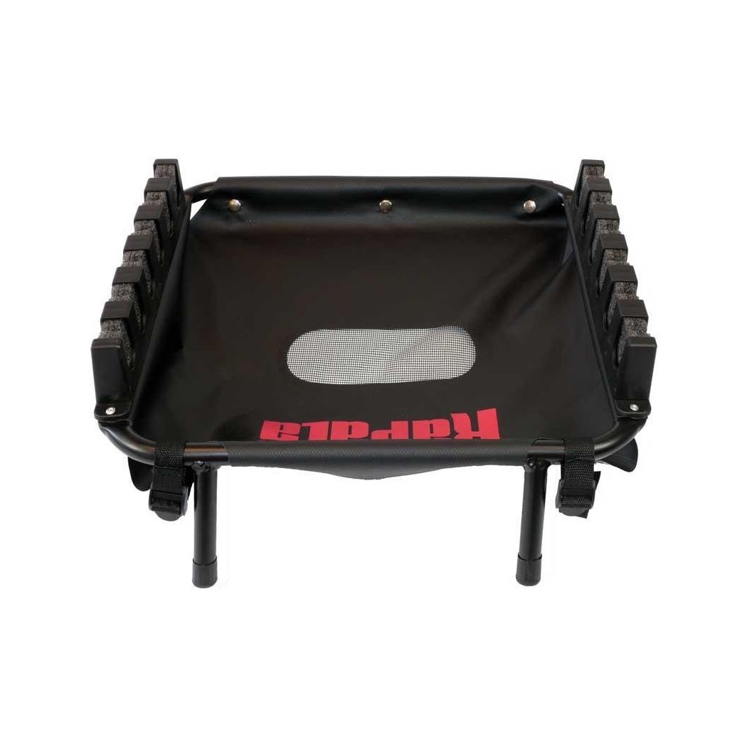 Il s'adapte à tout float tube, montage facile et rapide, il vous permettra de disposer de toutes vos cannes montées en un tour de main. Le système de rétention des cannes en mousse haute densité préformée s'adapte à tous les diamètres de cannes et vous permet de prendre les cannes ou de les reposer d'une seule main. Le bac en toile PVC dispose d'une évacuation d'eau en son centre (filet), c'est l'endroit parfait pour déposer quelques leurres en prévision des changements. Le support 6 cannes est l'outil indispensable pour répondre rapidement aux changements de leurres et de techniques en quelques secondes, la clé de la réussite sur l'eau.