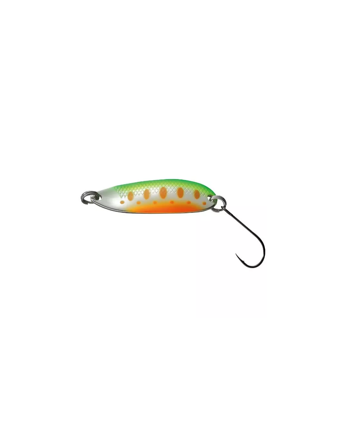 "Balance is the cornerstone of the spoon." These are the words of Hiramoto. Its S-shaped form raised at the attachment eyelet allows for slow swimming; contrasted in amplitude between the front and back. The fluorescent dots inside the curve allow you to track its movement. Its thickness of 1.2mm is suitable for a relatively slow stream.