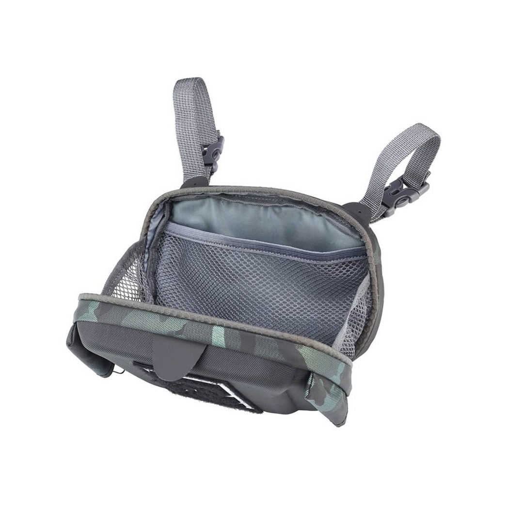La répartition du poids est optimisée par les bretelles réglables. Le revêtement matelassé et au tissage aéré laisse circuler l’air entre la peau et la matière. Doté de deux poches frontales à fermetures magnétiques, l’une dédiée au stockage des fils, l’autre à celui des boîtes. Ce système permet un accès rapide à l’ensemble des accessoires. Les deux poches latérales offrent un rangement du petit matériel. La languette frontale peut recevoir accroche-mouches velcro et les accessoires comme les pinces, dégorgeoirs ou ciseaux. Les trois poches dorsales permettent le rangement d’un vêtement, d’un camel bag et de matériel secondaire. Deux ganses intérieures assurent le bon positionnement d’une seconde canne montée.