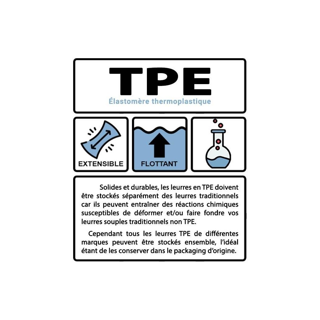 Bien que solides et durables (ils résistent très bien aux dents des prédateurs), les leurres en TPE doivent être stockés séparément des autres leurres souples traditionnels (PVC ou plastisol). Le TPE peut provoquer des réactions chimiques susceptibles de déformer et faire fondre vos leurres souples non TPE.