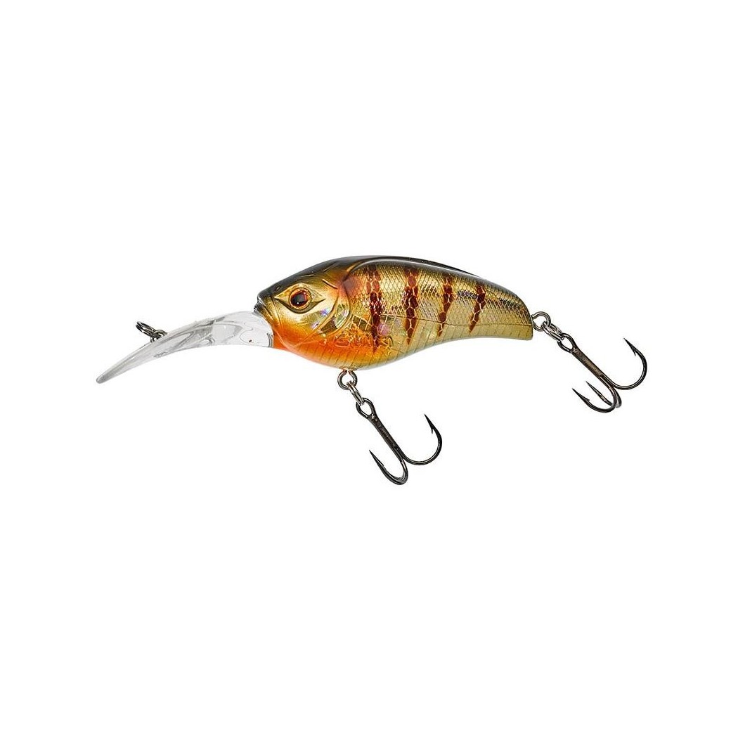 Un crankbait de 55mm dont la présence est vite perçue par les carnassiers grâce au fort volume d’eau qu’il déplace. Ce «passepartout » se désaxe très facilement dès qu’il lui faut contourner sur son chemin une branche ou une pierre. Sa bavette réalisée à partir d’un plastique polycarbonate très solide est tout indiquée pour ceux qui veulent «cogner le fond» en pratiquant le «bottom taping». Le Gigan est taillé pour les pêches plus profondes ou son «wobbling» prononcé (et un très léger «rolling») ne laisseront pas insensibles, perches, sandres et autre brochets. Sur ce modèle, nous avons volontairement réduit la signature sonore pour prolonger son utilisation tout au long de la saison quand les conditions deviennent difficiles et les poissons méfiants.