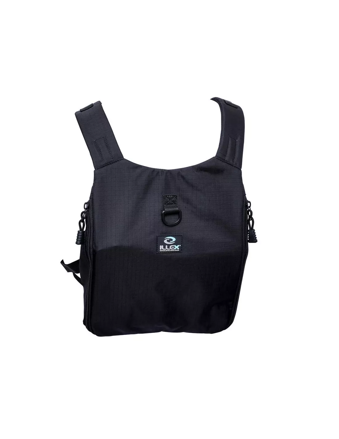 • Lato anteriore: scomparto principale portaoggetti (scatole per esche e accessori con chiusura a zip), sovrastato da due tasche intermedie con chiusura a zip, un ‘holster’ per una pinza con anello a D per fissarla e due tasche laterali ciascuna assicurata da un anello a D.