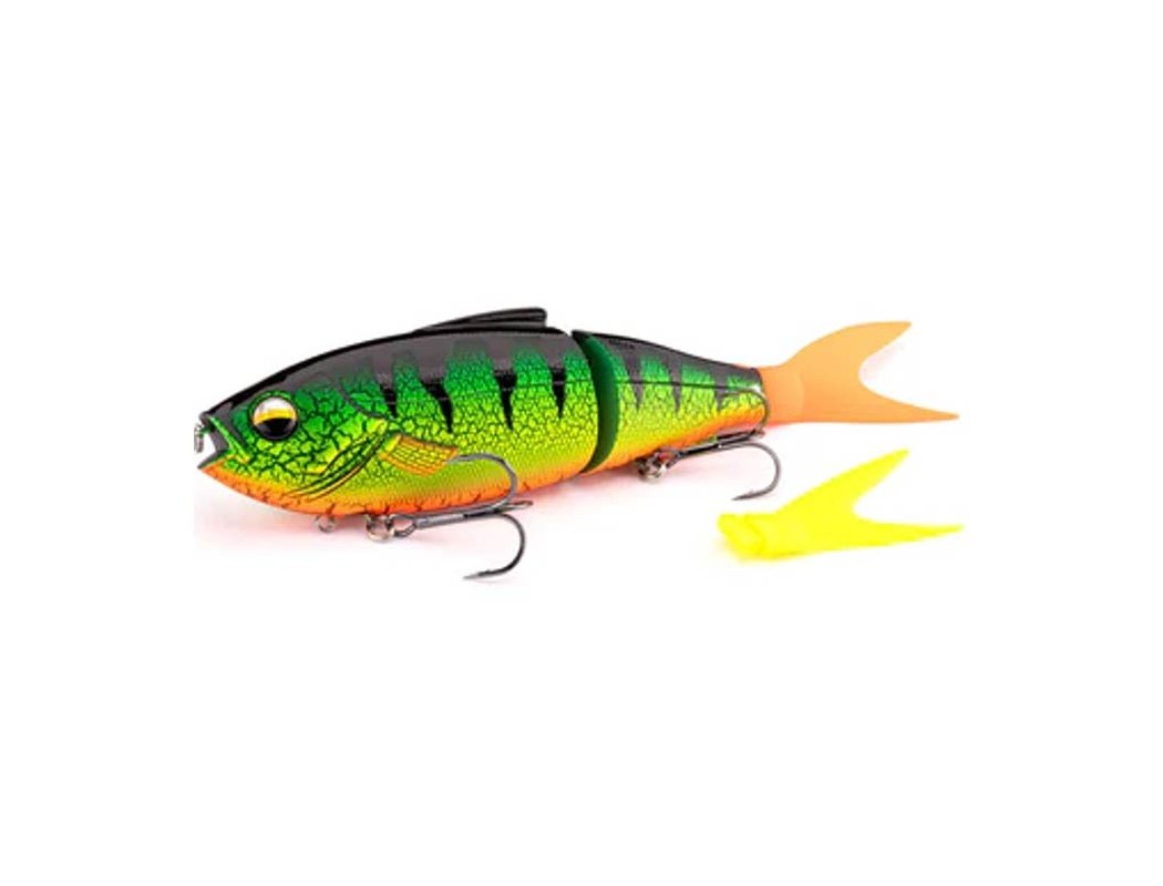 Le LMAB Real Vibe 180 mesure 18 cm et pèse 53 g. Il est disponible en douze designs stylés, dont six avec un film intégré pour un effet visuel renforcé. Pour varier les plaisirs, il est possible de changer la queue grâce à une queue de rechange. Ce swimbait est silencieux, sans billes sonores, ce qui en fait une option idéale pour les gros brochets méfiants et expérimentés. Les hameçons triples BKK ultra-piquants assurent une excellente tenue lors des touches. Ils sont fixés sur des émerillons, ce qui leur permet de tourner librement et réduit les risques de décrochage. Le Real Vibe 180 est un excellent swimbait, un ajout précieux à la boîte à leurres de tout pêcheur de brochet.